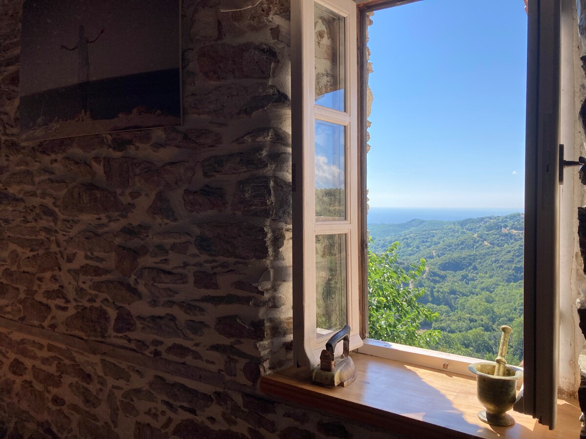 250m from the boisterous square, walking 7 minutes through the myth of Pelion and the history of Byzantine Makrinitsa, you arrive at the serenity of a genuine authentic place with magnificent view. Our grand father's stone house lays there. In 2022 we renovated it with respect to its traditional style, into a spacious idyllic guesthouse for 2+1 people, fully adapted to the traditional community of Makrinitsa, and yet providing modern amenities. A guest house ideal for the walkers. Discover it!
