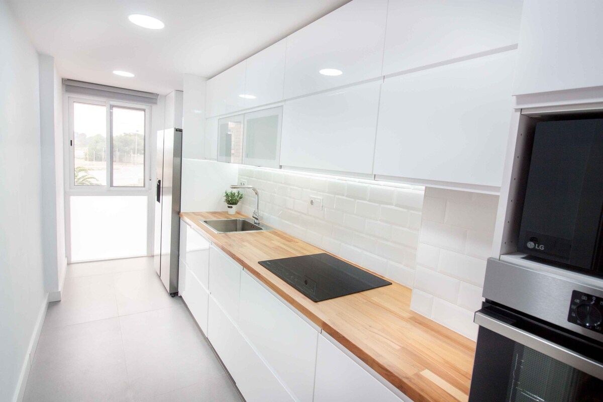 Modern and cozy apartment with all the comforts for 5 people. It is located on the first line just a few meters from the beautiful beach of Muchavista. It has a balcony with beautiful sea views .In the environment you have all kinds of services. Shops and restaurants around. The apartment is located in a quiet area perfect to enjoy throughout the year and it has everything you need to make you feel at home.