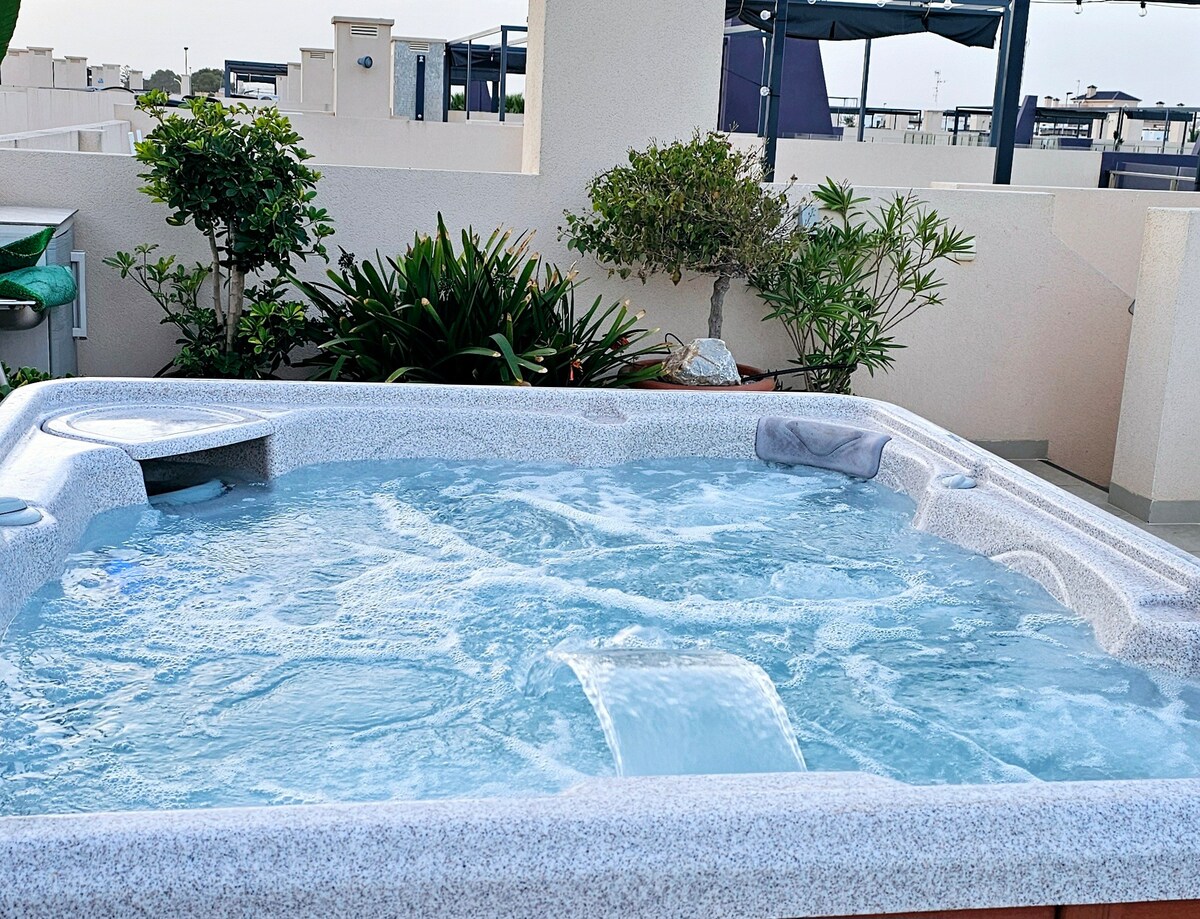 Privater beheizter Whirlpool auf der oberen Terrasse. Das Apartment liegt unweit vom Higuericas-Strand entfernt. 400 m zu Fuß entfernt und du befindest dich an einem großen Sandstrand. In der Urbanisation gibt es zwei ganzjährig geöffnete Swimmingpools, einen Spielplatz für Kinder und einen Fitnessraum im Freien. Die Gegend ist ruhig, ideal für lange Spaziergänge, das Dorf ist niedrig. Geräumig, ideal für Leute, die gerne Fahrrad fahren! 1,5 km zum Hafen von Torre de la Horadada. Bar-Restaurants am Strand