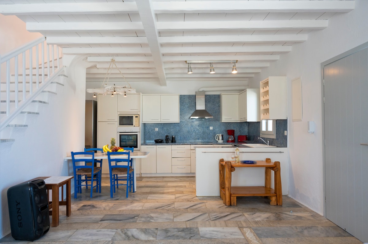 Willkommen in unserer brandneuen Villa am Wasser!! Sie befindet sich im luxuriösen Teil der Insel in der Gegend von Kalafatis, nur 4 Gehminuten vom Strand entfernt. Mache deinen Aufenthalt unvergesslich und genieße die besten Sonnenuntergänge und den Meerblick von deinem privaten Pool aus. 4 Schlafzimmer, alle mit eigenem Bad und Klimaanlage. Luxus trifft auf traditionellen Stil, damit du dich wie zuhause fühlst. 5–10 Minuten Fahrt von Ano Mera, Märkten und den meisten südlichen Stränden entfernt. Wir arrangieren auch jede Art von Service wie privaten Transport rund um die Uhr.