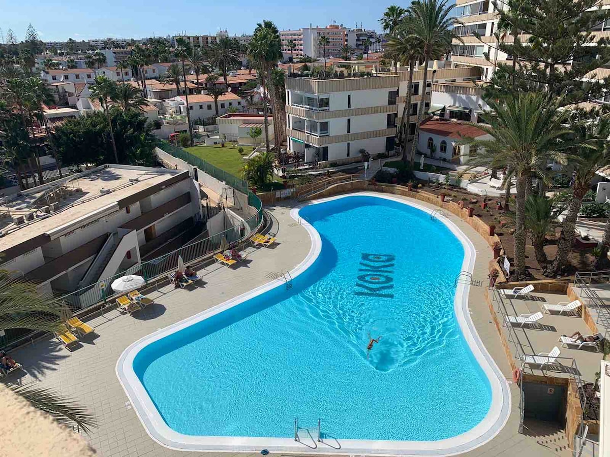 Gemütliche Unterkunft mit Klimaanlage in TOP-LAGE in einer ruhigen Anlage mit einem großen BEHEIZTEN(!) Swimmingpool. Zentrale Lage: 500 Meter vom Strand/Yumbo/Cita entfernt. Ruhige Einbahnstraße mit kostenlosen Parkplätzen. Check-in erst nach 18 Uhr! Geräumiger Süd-/Westbalkon mit Loungesofa und Esstisch „All Fresco“ für 4 Gäste. Amerikanische voll ausgestattete Küche mit grundlegenden Kochutensilien, Airfryer und Kaffeeecke. Smart-TV mit Chromecast. Helles und geräumiges Badezimmer. Zwei komfortable Schlafzimmer für 2 Personen.