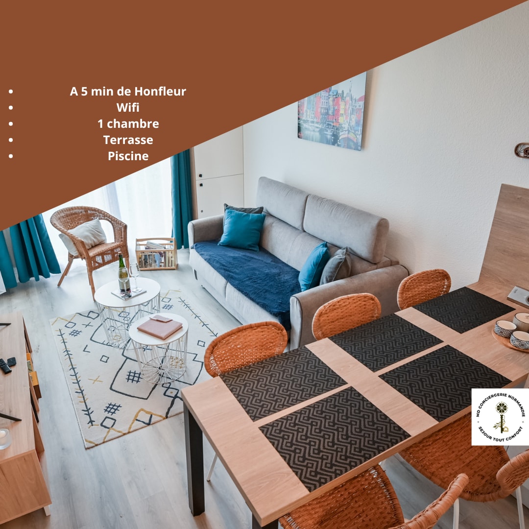 2 km von HONFLEUR ENTFERNT, Wunderschöne und sehr geräumige helle Wohnung zweizimmerwohnung für zwei Personen Wohnbereich mit Wohnzimmer, Essbereich und voll ausgestatteter Küche Die Atmosphäre ist sehr gemütlich und beruhigend mit allem Komfort für eine garantierte Entspannung. Gartenseite befindet sich das Schlafzimmer mit Queensize-Bett Am Fuße der Geschäfte des Dorfes, kostenlose Parkplätze gegenüber Ideale Lage, da zentral, um unsere schöne Region zu entdecken: Etretat, Deauville, Cabourg..