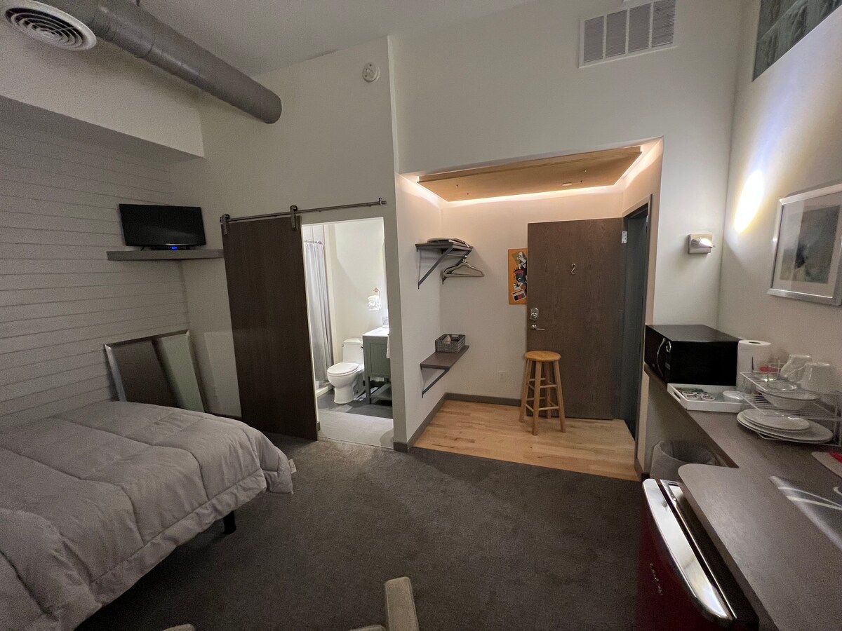 Die Lofts@42 bieten die einzigartige Erfahrung der Unterbringung in einer tatsächlichen Produktionsbrauerei. 42 North Brewing Company befindet sich im historischen Dorf East Aurora, NY. Diese Art von "Brewcation" ist einzigartig im Bundesstaat New York. Das Queen City Room verfügt über ein Dekor, das historische, industrielle Buffalo repräsentiert. Bilder von den Corn-Silos der Stadt und Originalschimmel von der Buffalo Foundry & Machine Co. schmücken die Wände. Ein Julia-Balkon bietet einen Blick auf den Biergarten der Brauerei darunter.