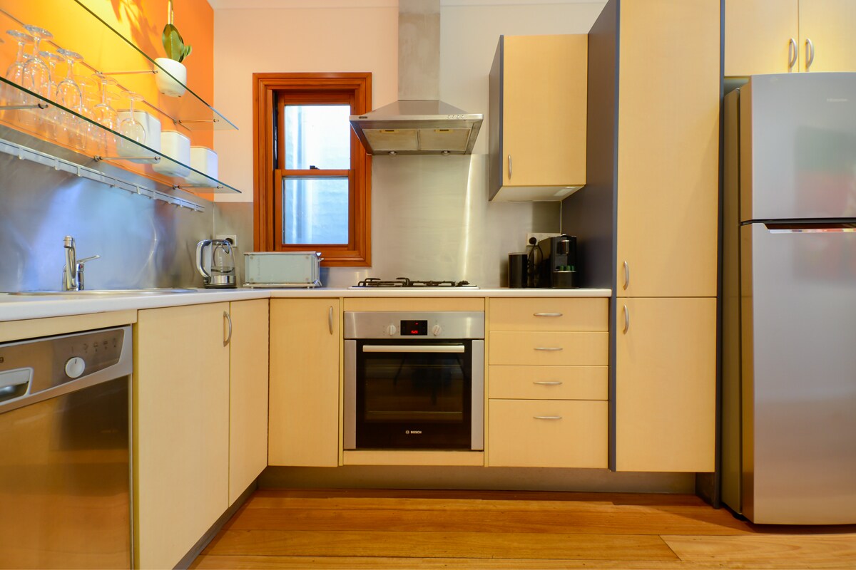 Diese renovierte Terrasse fühlt sich an wie dein Zuhause; hochwertige Möbel, WLAN (NBN Superfast), Netflix, Disney auf einem großen Smart-TV, ausgestattete Küche, Badezimmer in Hotelqualität (renoviert 2020), Waschmaschine und Trockner. Ruhig und dennoch extrem praktisch, das Haus befindet sich gegenüber einem grünen Spielplatz und nur einen kurzen Spaziergang von öffentlichen Verkehrsmitteln, den Hunderten von Geschäften und Restaurants der King Street sowie nur 20 Minuten vom CBD entfernt. Kanal-Klimaanlage oben und unten. Parkplatz für ein kleines Auto.