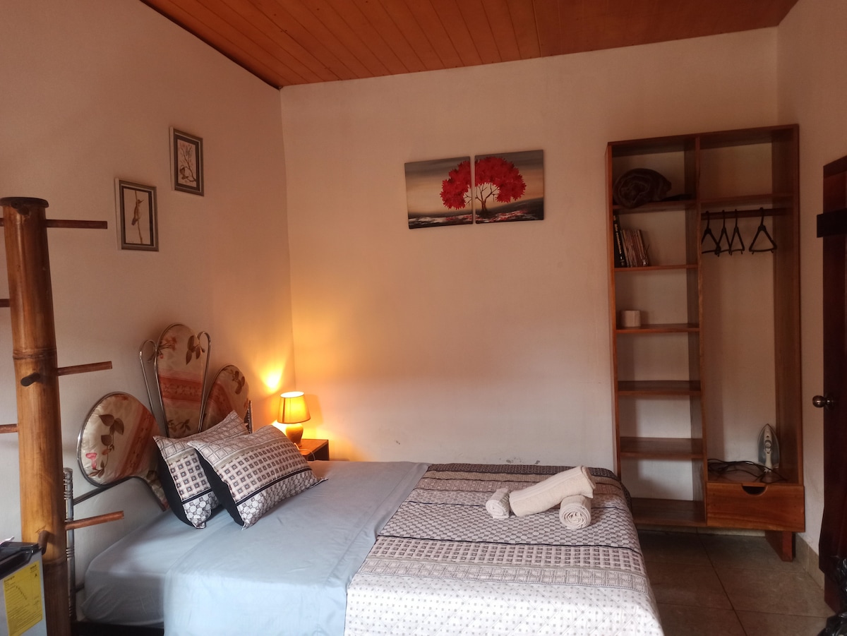 Dieses schöne Zimmer mit lokalen Harthölzern und warmen Eukalyptusböden verfügt über einen warmen Eukalyptusboden, der im Wolkenwald liegt, wobei der Canchupi River vorbeizieht. Ausgestattet mit einer kleinen Küche, einem komfortablen Bett, einem wunderschönen Sitzbereich und umgeben von Gärten. Zwei atemberaubende Türen öffnen sich in beide Richtungen - eines in Richtung des Yogastudios, des Flusses und des Loop-Trails und der andere in Richtung La Casa de Ceciia - ein ausgezeichneter Ort, um das Frühstück zu genießen, während du Vögel beobachtest.