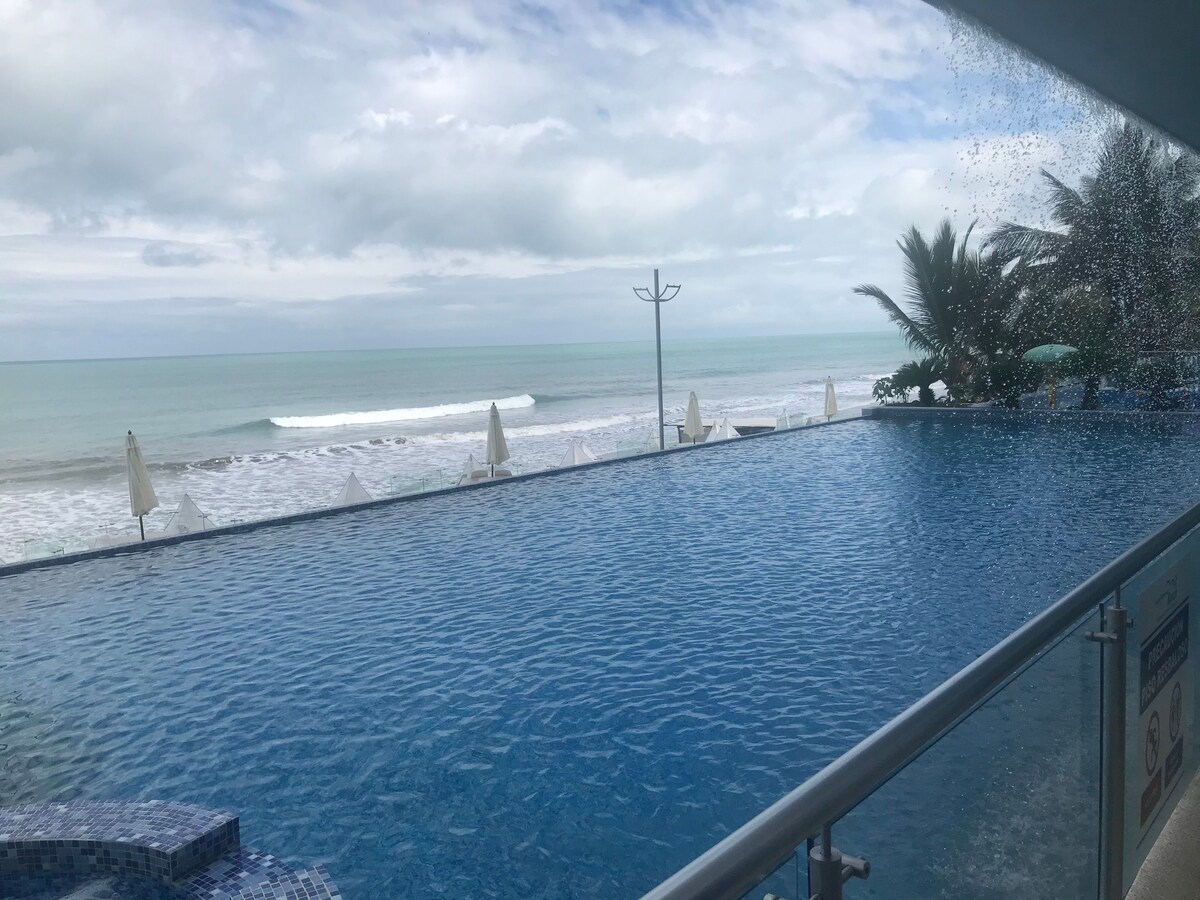 Fully furnished apartment in front of the sea with an amazing seaview in the private area of Casa Blanca, Esmeraldas. 3 bedrooms with full private bathrooms each one. Outdoor terrace with direct view to the pool and to the beach area of Same. Pool and confortable areas to sun tan. Total area of 150mts2 with around 40mts of outdoor terraces. Around 5 minutes walking of the beach. As an extra service with aditional fee there is an option to have cleaning and cooking services.