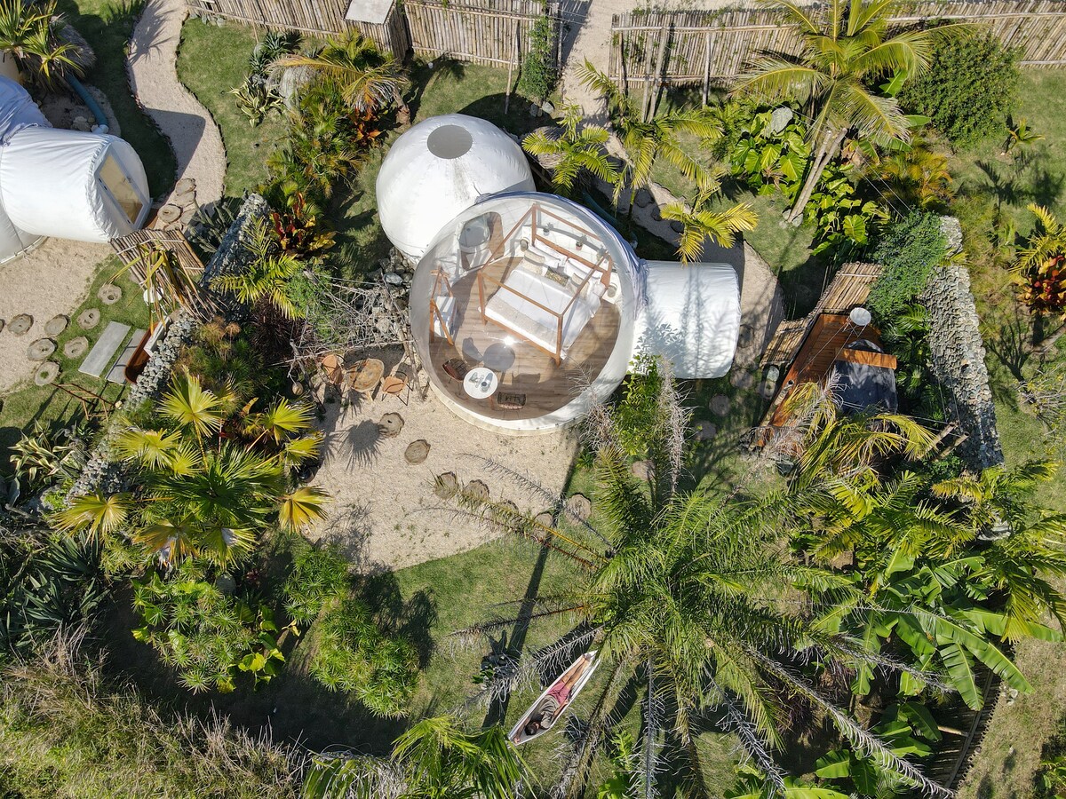 Bubble Glamping Ein Ort mitten in der Natur, der eine Trennung vom Alltag fördert, um dir zu helfen, dich wieder mit dir selbst zu verbinden und gleichzeitig die einzigartigen Aspekte der dominikanischen Landschaft zu erleben. Diese schöne Blase bietet dir ein exotisches Gartenerlebnis mit Außen-/Innenbadewannen und umgeben von Pflanzen, die Authentizität an jede Ecke bringen. Es verfügt über ein Kingsize-Bett, ein komplettes Badezimmer, einen Essbereich, eine Klimaanlage und eine perfekte Atmosphäre, um die Sternenbeobachtung bei Nacht zu genießen.