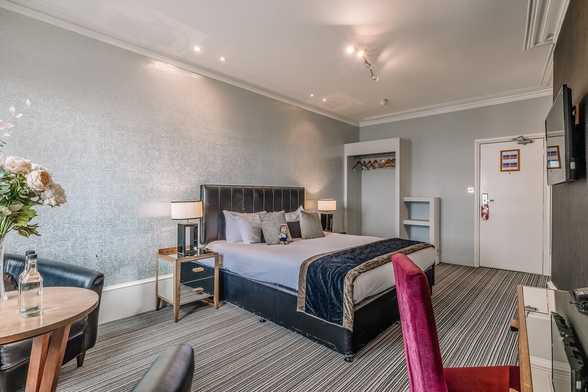 Zahnbürstenzimmer @ Lattice Lodge - ein Hotel mit gemeinsam genutzten Einrichtungen zur Selbstverpflegung. 14 abschließbare Schlafzimmer mit eigenem Bad, Mikrowelle und Minikühlschrank. Eine große, voll ausgestattete Gemeinschaftsküche, ein Esszimmer, eine TV-Lounge und ein Wintergarten. Kostenlose Parkplätze und alle Zimmer verfügen über Smart-TVs und 200 MB unbegrenztes kostenloses WLAN. Diese KINGSIZE-SUITE im Erdgeschoss kann ein Kingsize-Doppelbett oder zwei Einzelbetten sein, ein Fenster, einen Schreibtisch/Stuhl und ein Sofa, ein Duschbad mit Pflegeprodukten, einen Einbauschrank und Kleiderbügel, einen Haartrockner und einen elektrischen Ventilator.