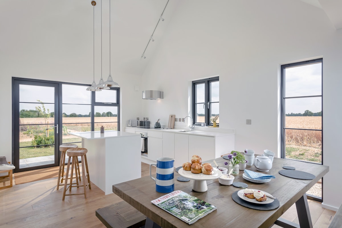Die kürzlich umgebaute Nissen-Scheune befindet sich auf einem Bauernhof auf einer eigenen privaten Wiese. Die Scheune ist umgeben von der wunderschönen Landschaft von Essex - sanfte Hügel, alte Bäume, Wildblumen und Gräser, Hecken, Pferde und Schafe. Die Umwandlung wurde im März 2021 abgeschlossen und bietet Platz für 4 Erwachsene in 2 großen Schlafzimmern. Es gibt auch ein Loft-Schlafzimmer, das durch eine versteckte Tür zugänglich ist, mit einer Kingsize-Matratze, die für ältere Kinder oder ein Paar geeignet ist. Perfekt für Familien, aber beachte, dass es keinen geschlossenen Garten gibt.