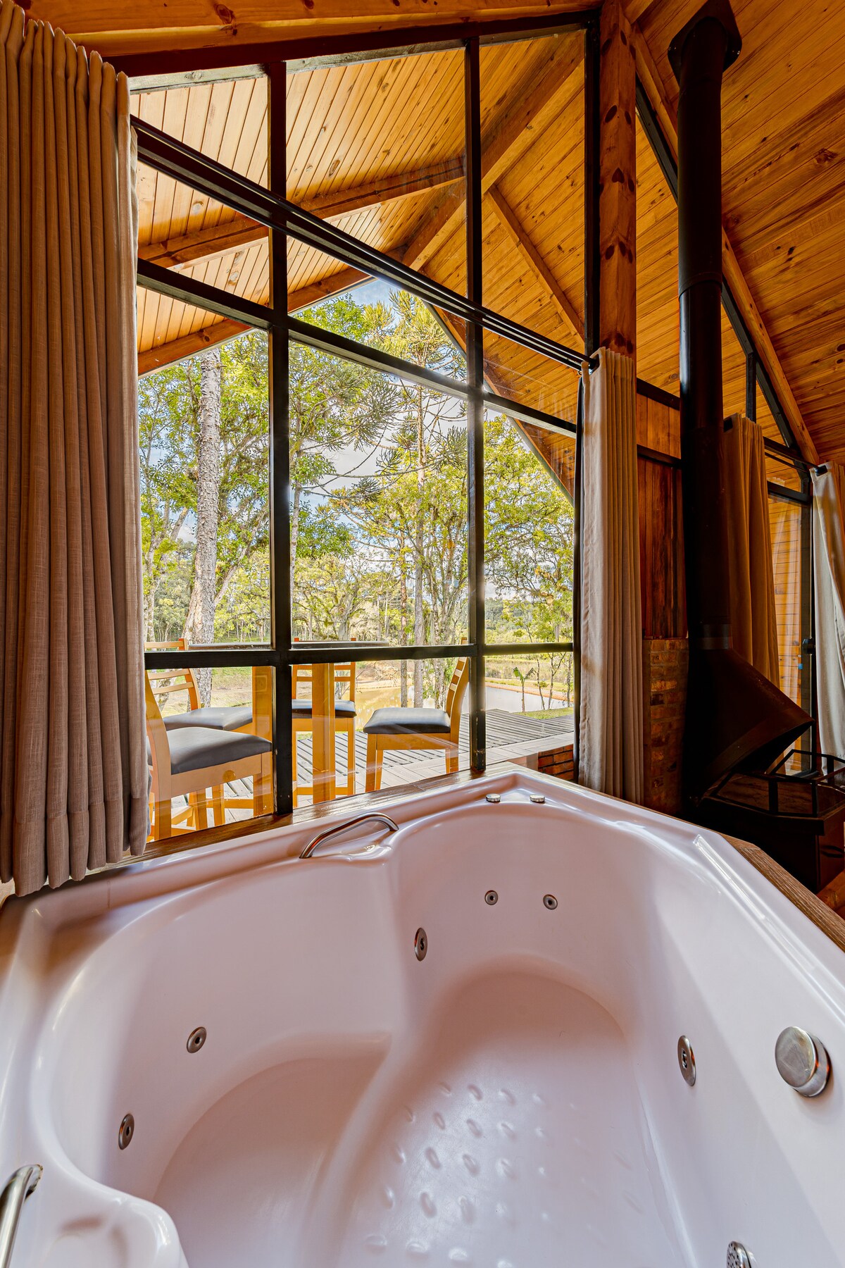 Nossas cabanas foram cuidadosamente pensadas para proporcionar uma sensação de conexão com a natureza e conforto ao mesmo tempo. Cada cabana possui uma peculiaridade, que leva você a apreciar o verde da mata, o som do riacho e o canto dos pássaros mesmo de dentro das cabanas. Você poderá desfrutar do calor da lareira, acompanhado por uma taça de vinho ou de um banho relaxante de banheira de hidromassagem
