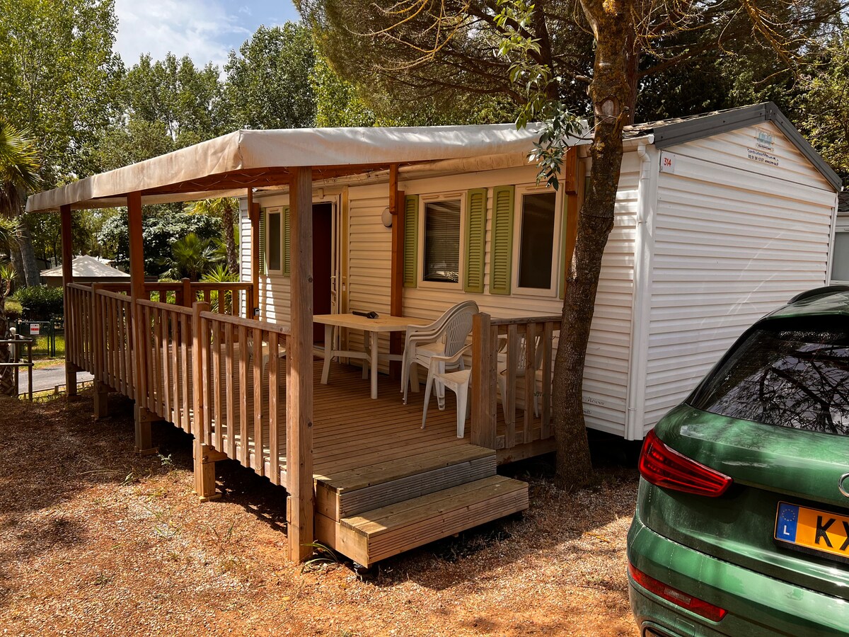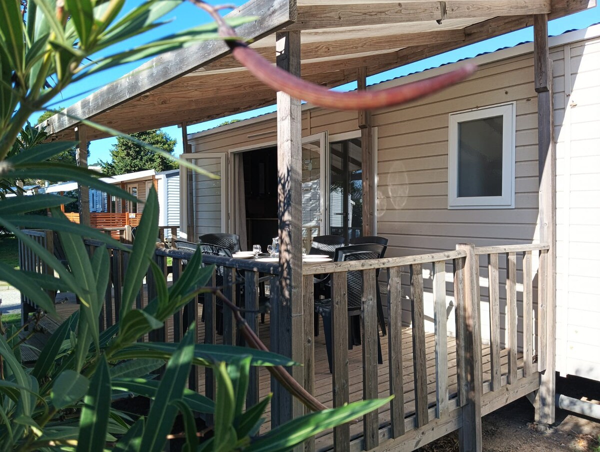 **Wache zum Vogelgesang auf!** Premium-Mobilheim, ideal gelegen in einer ruhigen Gegend. 5 km von den Stränden von Aresquiers, 1 km von ornithologischen Lagunen und Buschland-Massiv. Geschäfte in der Nähe. Voll ausgestattete Unterkunft (6 Personen) mit flexibler Aufteilung. - Klimaanlage • voll ausgestattete Küche • Wohnzimmer - Eckbank • Duschraum, separates WC • Überdachte Terrasse mit Tisch und Stühlen • Privatparkplatz • Wasseranlage: 2 Pools + Rutsche + Planschbecken • Eigener Concierge-Service (verbesserter Aufenthalt)