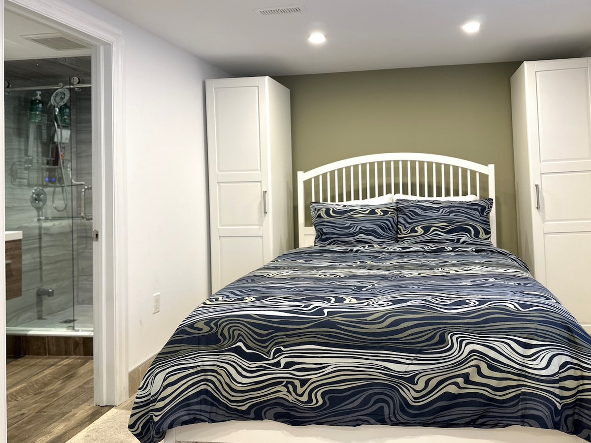 Dieser schöne Raum ist die perfekte Mischung aus gemütlich und hip. Sie hat viel Licht und ist mit den meisten Annehmlichkeiten ausgestattet, die du für deinen Aufenthalt benötigst. Die Unterkunft in unserem Haus wird von mir und meiner Frau Ariana geführt. Es ist die perfekte Umgebung für jede Familie. Sie verfügt über ein Wohnzimmer, ein Schlafzimmer (mit einem Queensize-Bett) und ein 3-teiliges Badezimmer.