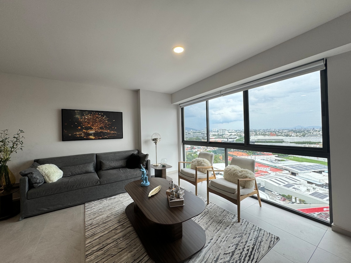 - Pool auf der 22. Etage - Schöner Fitnessraum mit Blick auf die Stadt - Voll ausgestattet für lange Aufenthalte - Parkplätze verfügbar (gegen Aufpreis) - Housekeeping-Service: Einmal pro Woche bei Buchung von +7 Nächten Dieses Deluxe-Studio mit Balkon bietet alles, was Sie für Ihren Aufenthalt brauchen. Das Hotel liegt in einem brandneuen Luxusturm im Viertel Providencia, in der Nähe des Einkaufszentrums Midtown Jalisco.