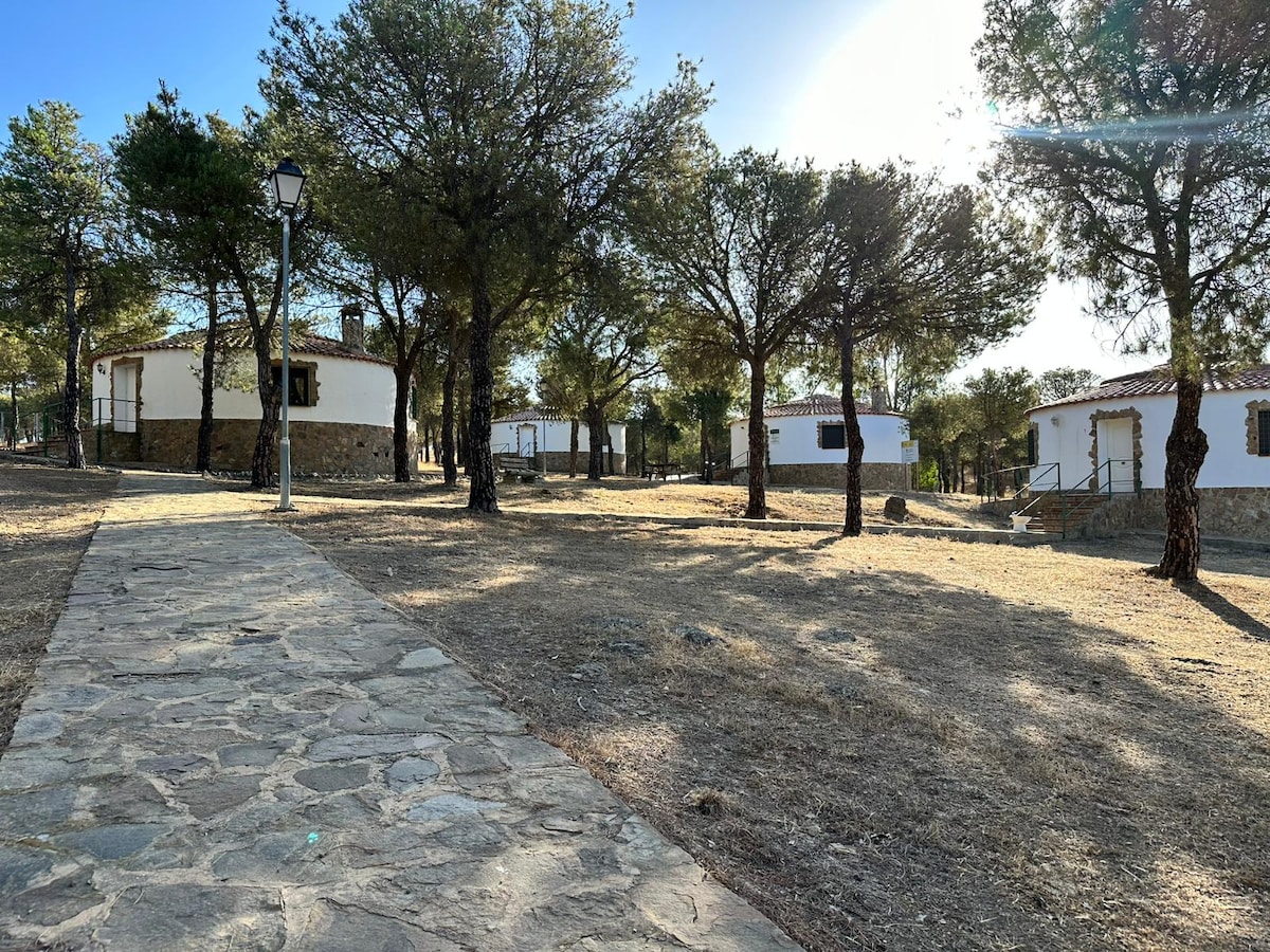 Complejo rural, 4 preciosos chozos rurales con capacidad de 5 personas cada uno, en el enclave del Parque Natural Las Quinientas. Ubicado en un municipio extremeño. integrados en el entorno natural del parque Las Quinientas. Alrededor hay zonas verdes, senderos bajo pinos, rincones para descansar al sol y espacios para contemplar el cielo nocturno, lejos de la contaminación lumínica. En el conjunto también hay zonas comunes como piscinas, merenderos, barbacoas y jardines