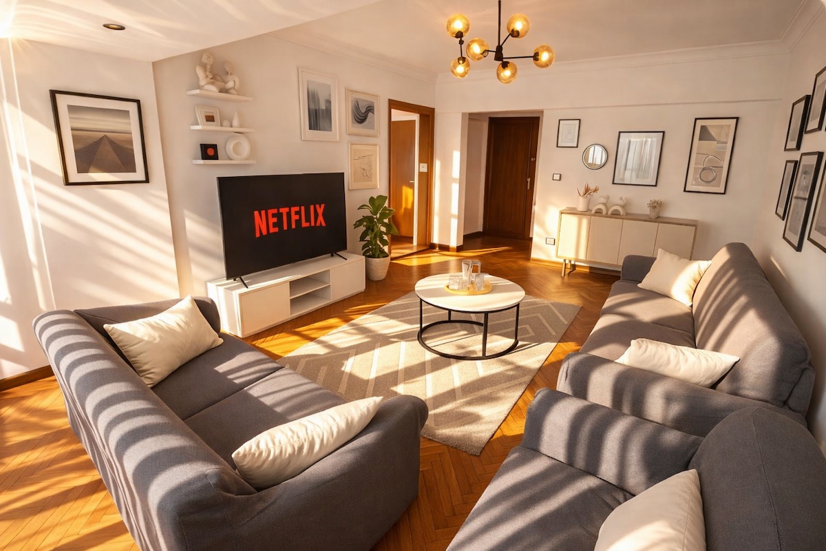 Luxuriöses Studio mit modernem Design und entspannter Atmosphäre, in ruhiger Lage in Nasr City nahe der City Stars Mall. Verfügt über eine private freistehende Badewanne mit heißem Wasser und Dusche, orthopädische Matratzen für ultimativen Komfort, eine voll ausgestattete Küche und Highspeed-WLAN. Perfekt für Paare, Alleinreisende und Geschäftsreisende, die eine saubere, gemütliche, private und ruhige Unterkunft in der Nähe des Flughafens und der Hauptattraktionen suchen.