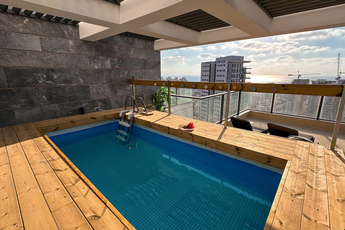 stylish penthouse with gorgeous sunset views! Enjoy a spacious terrace with a swimming pool in the summer (June–October) and a hot tub year-round. Elegant master bedroom with a balcony and bathroom, and a safe room with another bathroom. Located on the 7th floor — bright, airy, and welcoming. Private parking . Just 10 min from Tel Aviv and 20 min to the beach, cafes, and restaurants. In Holon’s best, most central neighborhood — vibrant, lively, and full of charm. — your perfect urban retreat!