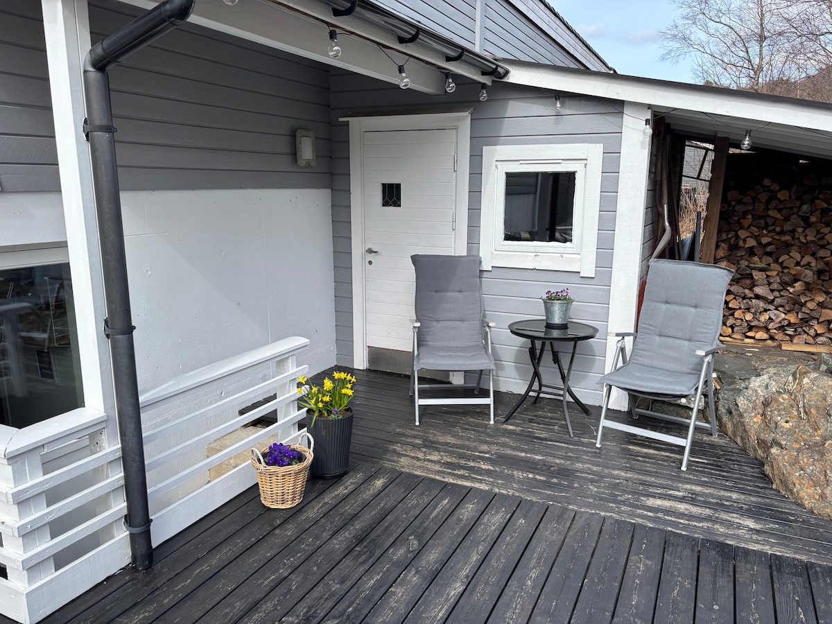 Come live in this cozy terraced house while visiting Bergen with your family and furry friends. The house is placed in a quiet neighborhood while being just 10 minutes away from the city centre. Enjoy a beautiful view over the valley and surrounding mountains at both sunrise and sunset from our spacious terrace.