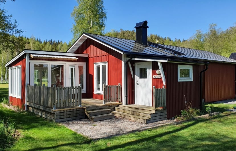 Vakna till helt tyst natur, bada från egen brygga och avsluta kvällen med grill och solnedgång över sjön! Smakfullt renoverad stuga med sängplatser för 6 personer fördelat på tre sovrum. Stugan ligger ensamt intill sjön vilket gör att läget är helt ostört och fridfullt! Trots sitt lugna och fridfulla läge är det inte mer än ca 10 minuter till livsmedelsaffär och 25 minuter till köpcentrum. Svamp- och bärplock finns runt knuten! Plasteka och åror finns att låna.