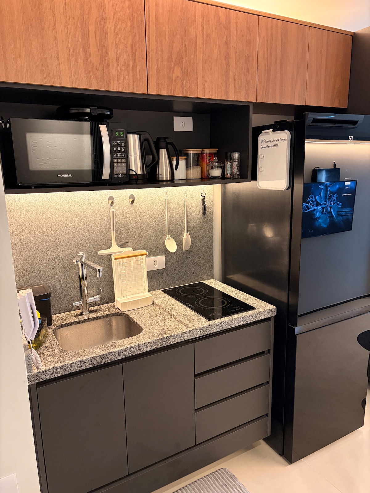 Studio novo e equipado! WI-FI 500 Mb! LAZER COMPLETO, piscina, coworking, academia, lavanderia, cinema, brinquedoteca e mini mercado. Na melhor localização de Pinheiros a poucos metros do metrô! Rua tranquila em meio a vários restaurantes e cafés com ótimas avaliações. Próximo a vários pontos túristicos. - cama QUEEN colchão Lunna novo - enxoval completo para te 4 hóspedes - Tv retrátil - Wi-Fi 500mb - cozinha completa com todos os utensílios - self checkin