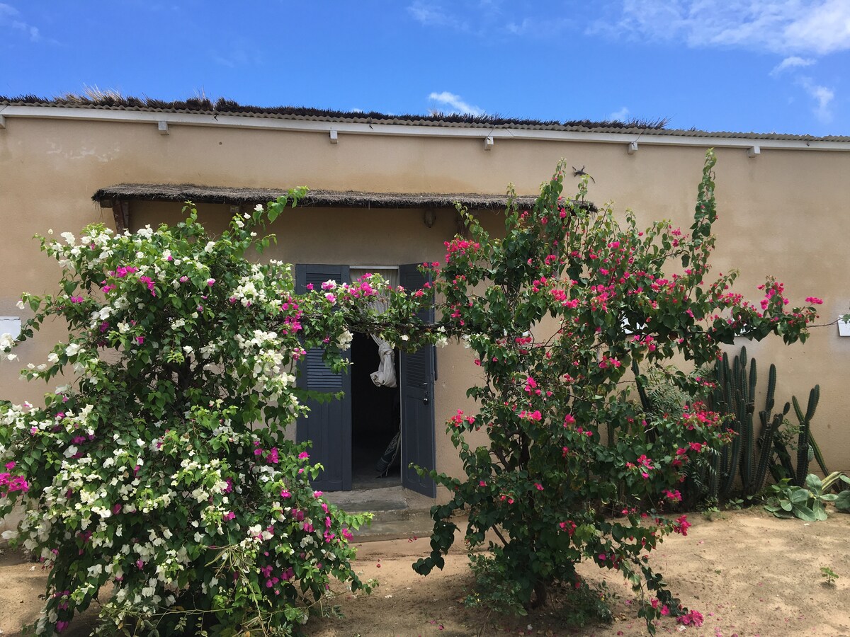 Palmarin, village authentique au cœur du Sine Saloum. La maison se situe à quelques centaines de mètres du village dans un jardin arboré de 3500 m2, au bord de l'océan et à la limite de la réserve naturelle communautaire. La chambre est située face à l océan , au bout du jardin. Chambre avec salle d'eau (douche eau chaude, lavabo, wc). lit 2 personnes avec moustiquaire, armoire, bureau. ventilateur. Possibilité d' un lit supplementaire d'1 personne . La piscine pour vous rafraîchir!