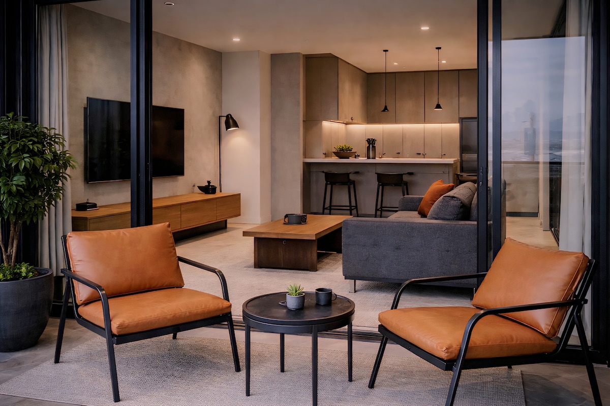 An industrial-modern executive suite centered around a versatile island nexus that seamlessly connects work, dining, and urban living in the TRX district.