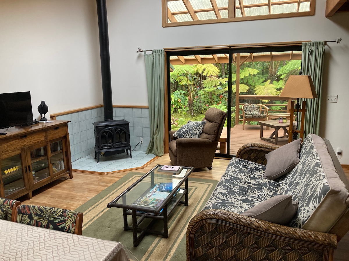 Good news, I have upgraded my WiFi to the best in our area. I know now our guest needs have changed and good WiFi is a must. We also added a covered deck with a BBQ for your convenience. Volcano Hidden Cottage is centralized location making exploring the East side of the Big Island easy. Very private, Full of Romance, Kitchen, fireplace, and lots of window overlooking rain forest.