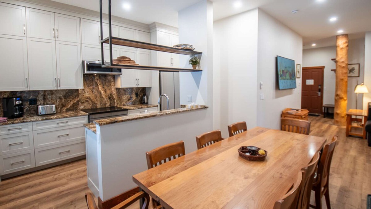 Our ski-hill condo has been fully renovated and redesigned. There are designer touches throughout, plus high-end furnishings and appliances for your enjoyment. In addition to the master bedroom, there is another sleeping area with a twin bunk, and queen bed. There are also two designer shower rooms. Furthermore, there are a number of other areas available to guests of Snow Creek: locker room, underground parking, laundry facilities, gym, outdoor pool, and outdoor hot tubs.