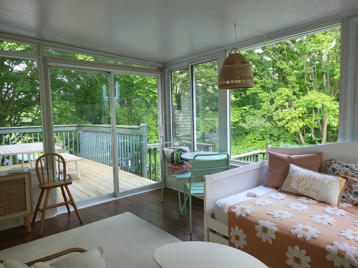 🇨🇦 Eine ruhige Suite mit 2 Queensize-Betten, Seeblick, 3 Minuten zu Fuß zum Erie Rest Beach, 3 Minuten Fahrt (20 Minuten zu Fuß) ins Dorf. Alle Strandausrüstung inkl. Stühle, Strandmatten, Handtücher, Schattenzelt, Schwimmkörper, Sonnenschirme! Jede Menge Indoor-Board-Spiele, alles, was du zum Kochen oder Grillen benötigst. Entspannen, spielen, einkaufen, Live-Musik hören, in ausgezeichneten Restaurants essen oder liefern! Es gibt viele Dinge zu sehen und zu erleben! Genieße die Natur (Hirsche & Weißkopfseeadler) auf einer ruhigen privaten Terrasse. Klimaanlage ist ein eiskalter oder gemütlicher Gaskamin!