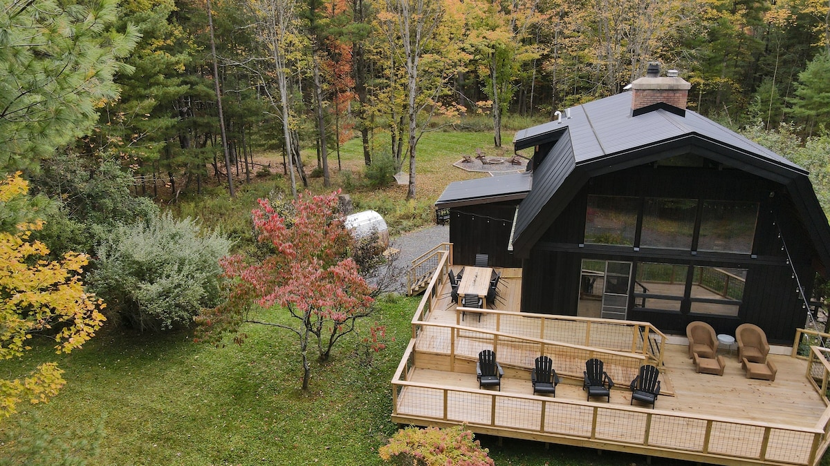 Das Hideaway at North Forest FLX • 4 Minuten zum Keuka Lake, 20 Minuten zum Watkins Glen • 4 Schlafzimmer, 2 Badezimmer, 8 Personen bequem • Fasssauna + 2 Badewannen im Freien • Stufenfreies Layout mit ebenerdiger Dusche für verbesserte Zugänglichkeit • 30 private Hektar Wald mit Wanderwegen und Wildtieren • Voll ausgestattete Küche, Esszimmer für 8 Personen, gemütliche Wohnräume • Starlink WLAN, Smart TVs, individuelle Raumheizung/-kühlung • weitläufige Decks, Feuerstelle, Hängemattenstuhl, Erholung pur
