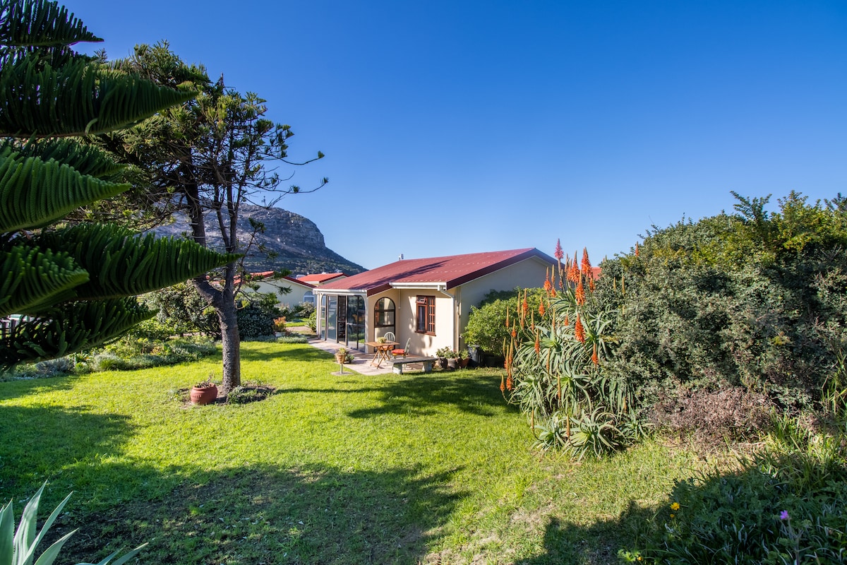 Unser Steingarten ist etwas Besonderes! Es wurde kürzlich aus Stein gebaut, der auf dem Grundstück gefunden wurde. Beobachte spektakuläre Sonnenaufgänge über False Bay und der Strand und der Gezeitenpool sind nur einen kurzen Spaziergang entfernt. Schön und gemütlich auch im Winter, mit einem Holzofen. Die Rockery-Wohnung besteht aus einem offenen Wohnzimmer und einer Küche, die auf eine Holzterrasse führt, und zwei Schlafzimmern mit eigenem Bad. Es gibt einen sicheren Parkplatz abseits der Straße für ein Auto und einen Braai-Bereich mit Aussicht.