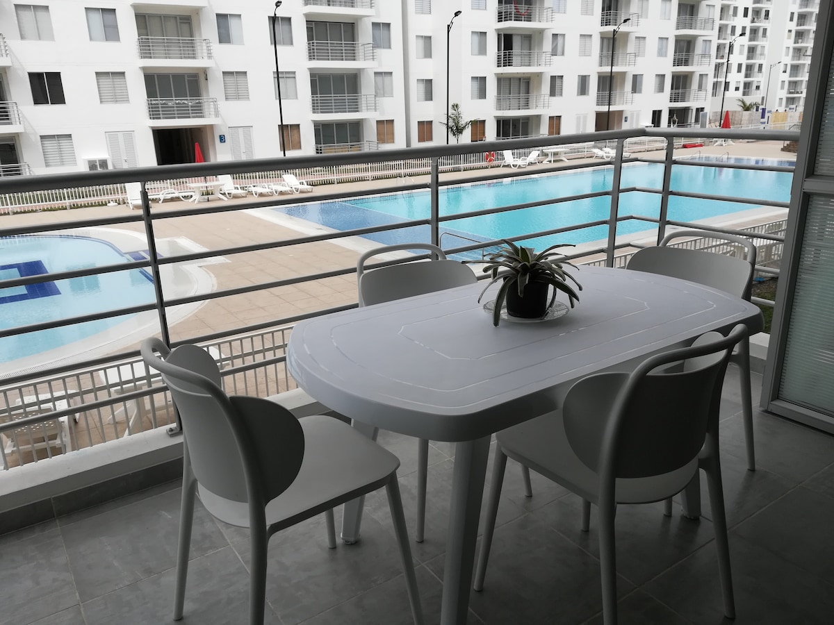 Magnifico apartamento con espectacular vista, completamente dotado. Dos habitaciones cada una con aire acondicionado. Wifi, Smart TV en sala y habitaciónes con las aplicaciones de Streaming (Ingresar con sus propias cuentas debido a las políticas de las plataformas), BBQ gas natural en balcón, hamaca. Conjunto con jacuzzi, piscinas, tenis de mesa, billar pool, futbolín, gimnasio. Complejo deportivo con canchas de tenis, futbol 5, cancha múltiple, parque infantil e iglesias