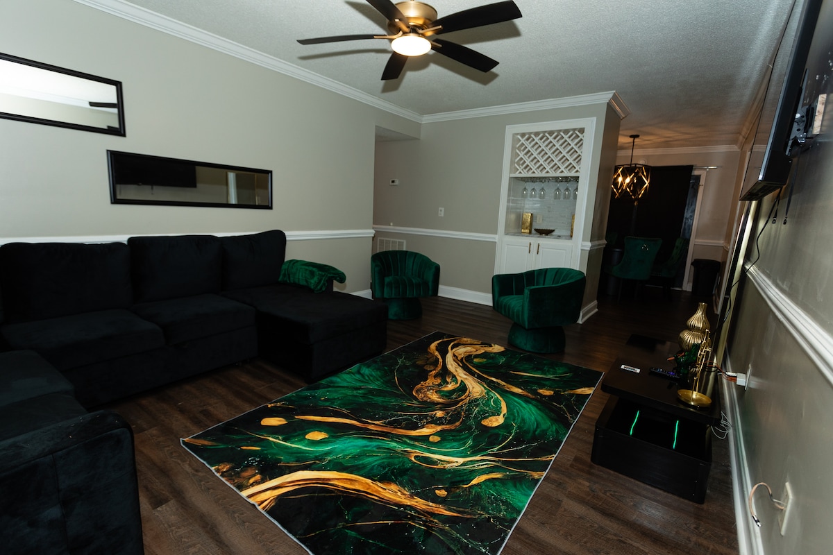 Diese stilvolle Wohnung im zweiten Stock eignet sich perfekt für Gruppenreisen. Neu renoviert und geschmackvoll mit spa-ähnlichen modernen Akzenten und Annehmlichkeiten eingerichtet, um deinen Aufenthalt angenehm zu machen. Der Sonnenraum verfügt über einen Indoor-Schaukelstuhl, der sich perfekt zum Entspannen und Lesen eignet. Es gibt ein individuelles Unterhaltungszentrum mit einem 55-Zoll-Fernseher, Akzentbeleuchtung und einem elektrischen Kamin. Es gibt eine große Küche mit einer Kaffeebar, einer Eismaschine und gefiltertem Leitungswasser.