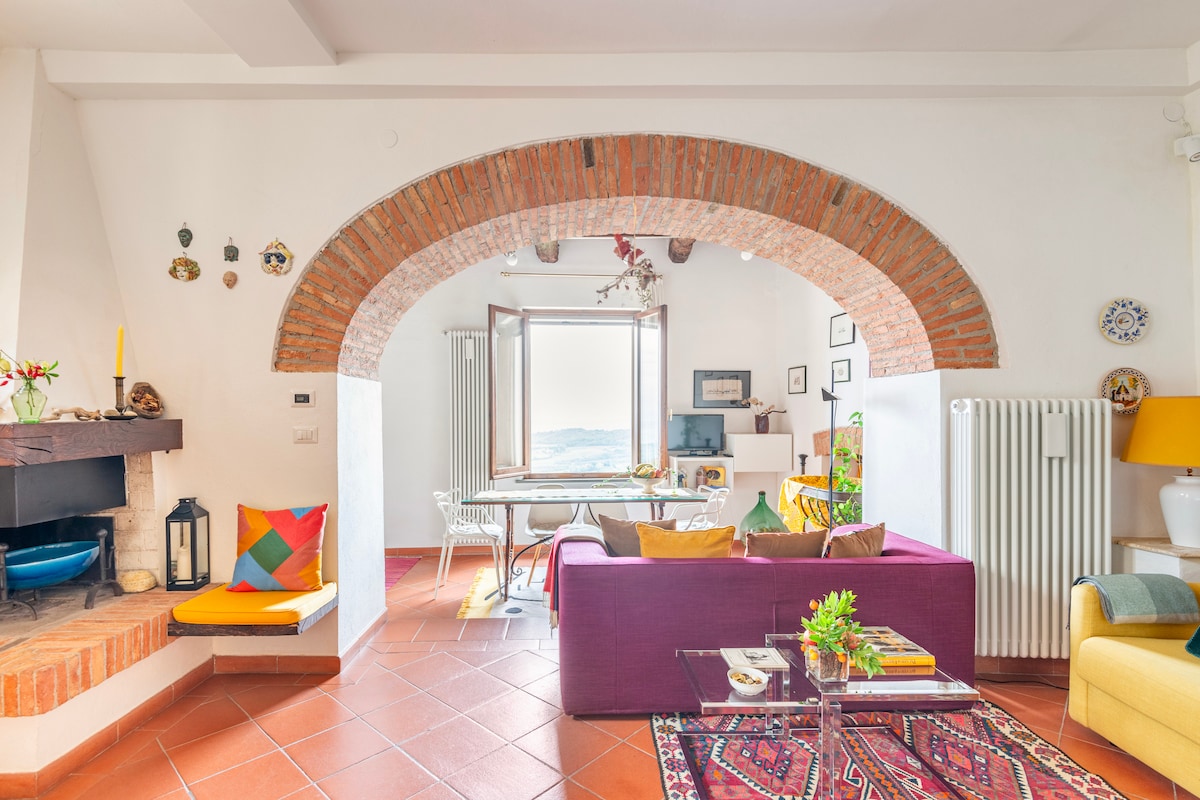 Versati un bicchiere di vino e accomodati di fianco al caminetto di questo open space dalla calda atmosfera tipicamente toscana: travi in legno, pavimento in cotto, pareti in pietra. Poi esci e ammira il magnifico panorama sulla Valdichiana. Pour yourself a glass of wine and sit next to the fireplace of this open space with a warm Tuscan atmosphere: wooden beams, terracotta floors, stone walls. Enjoy yourself and relax! Then go out and admire the magnificent view of the Valdichiana.