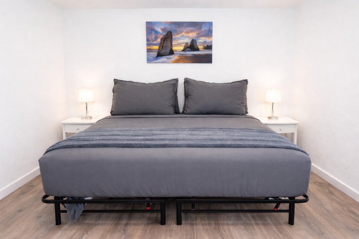 A beautifully remodeled flat in light filled walkout basement with 1 bed /1 bath flat that sleeps 4, w/island kitchen, luxury queen bed, electric fireplace, full sleeper sofa, coffee bar, game table & desk. Keyless access leads to a relaxing covered patio, outdoor bar, grill and sitting area. Private covered parking. There are full time tenants above the flat. They are very considerate and know to limit noise, especially during quiet hours of 10pm - 10am.