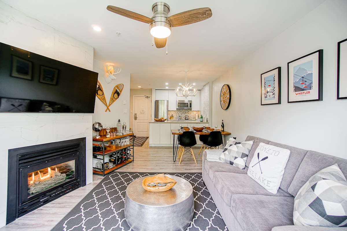 Welcome to your mountain oasis. A 1 min walk from the Blackcomb lift! Our modern condo is a bright, spacious 1 bedroom with wrap around windows for perfect tree-lined and mountain views. Look right up Whistler mountain while sipping coffee from your kitchen table! The suite has it all: - king bed - sofa bed - full kitchen including a new dishwasher - soaker jet tub - Keurig - Bose speaker - central A/C - upgraded July 2025 The building has a gym, laundry, pool and outdoor hot tub.