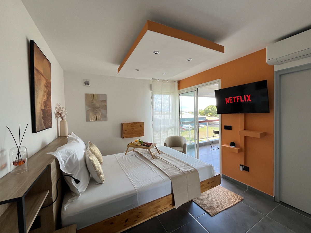 Charmante Unterkunft der gehobenen Klasse, in einer sicheren, ruhigen und diskreten Residenz mit Pool, sehr gut gelegen, 2 Minuten vom Stadtzentrum von Cayenne entfernt. In der Nähe der Einkaufszentren von Matoury, Rémire Montjoly und seinen Stränden. Kostenlose Parkplätze. Ideal für Geschäftsreisen oder eine außergewöhnliche Übernachtung. Premium-Wohnung mit: - 1 klimatisiertes Schlafzimmer mit Smart-TV, Netflix, Prime Video, Orange TV, Doppelbett -1 voll ausgestattete Küche, -1 einladende Terrasse