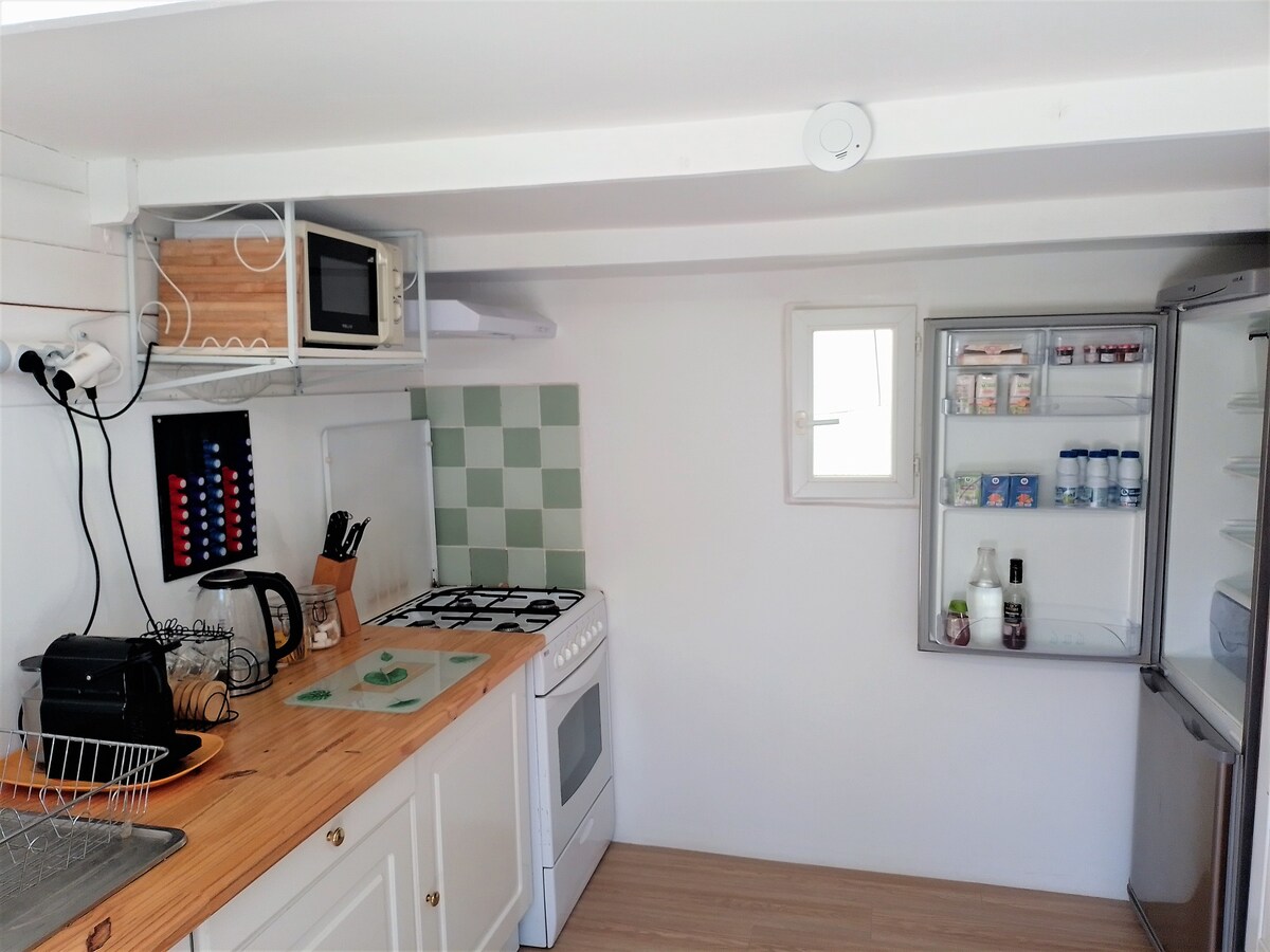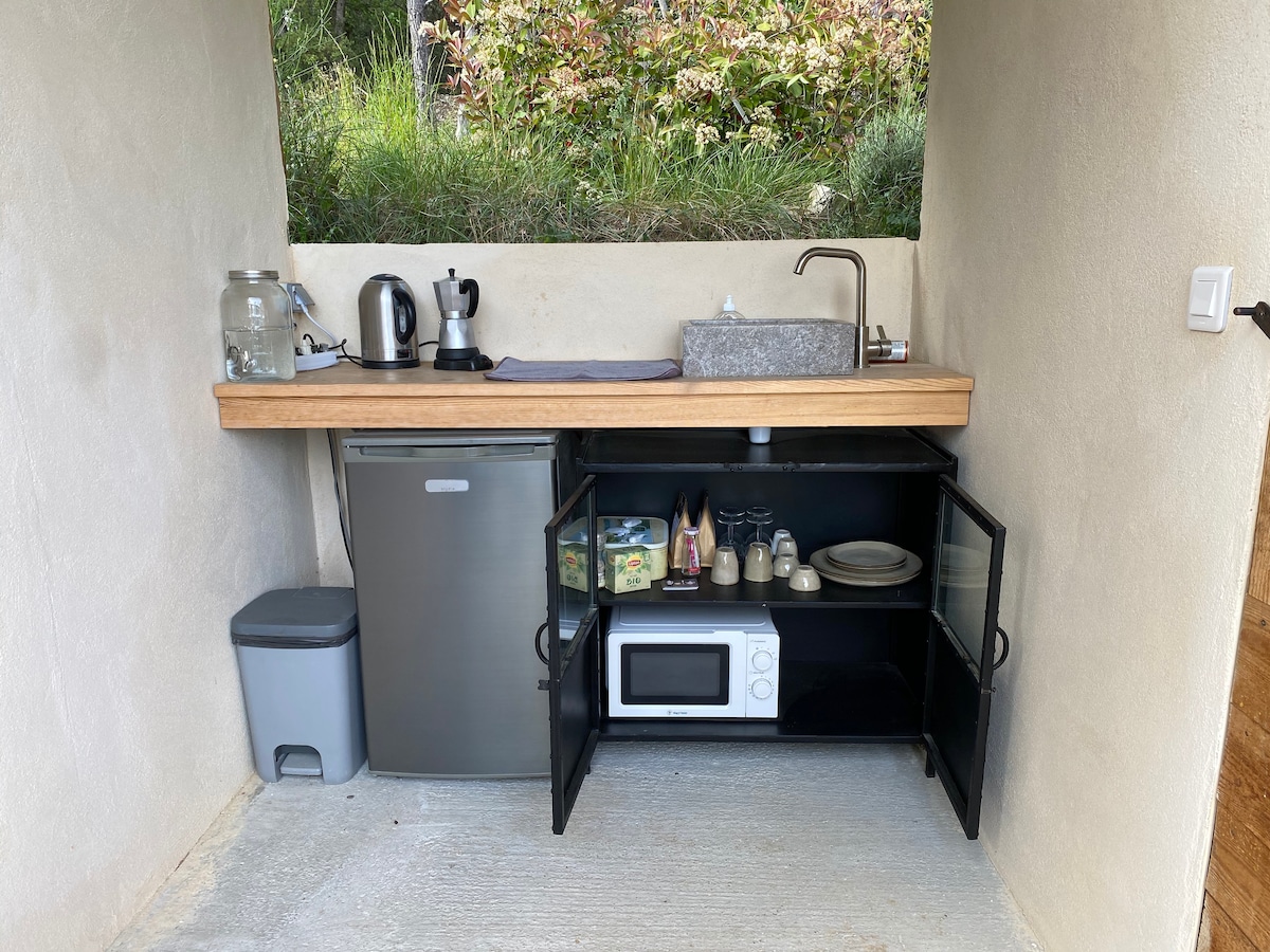Laissez-vous bercer par les sons de la nature dans ce logement unique aux allures de bohème de 30m2 pour un agréable séjour détente Espace isolé et privé de 100 m2 donnant sur une oliveraie. Equipé d'un lit grand confort 160x200 et de 2 fauteuils (couchage enfants) Table basse à l intérieur cafetière bouilloire vaisselle à votre disposition. Coin repas extérieur abrité avec table 4 chaises éclairage, évier et point d'eau. Jolie salle de bain à 25 m douche WC lavabo réfrigérateur micro ondes