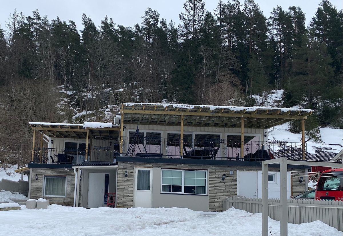 Wir vermieten die 1. Etage unseres Hauses. Das Apartment verfügt über zwei Schlafzimmer, ein Wohnzimmer mit Essecke und zwei Sitzbereichen, einen mit TV, einen mit Blick auf den Osloer Fjord und Oscarsborg, eine eigene Küche und ein Bad/WC mit Badewanne und Waschmaschine. Ungefähr 105 qm. Die Unterkunft befindet sich in einem ruhigen Hüttengebiet mit Nähe zu Wald und Meer. Zwei Terrassen stehen von der Wohnung aus zur Verfügung. Kurze Entfernung nach Seierstenmarka. 12 min zu Fuß zum Schwimmbereich neben dem Fjord. 1,5 km zur Bushaltestelle 2 km in die Innenstadt.