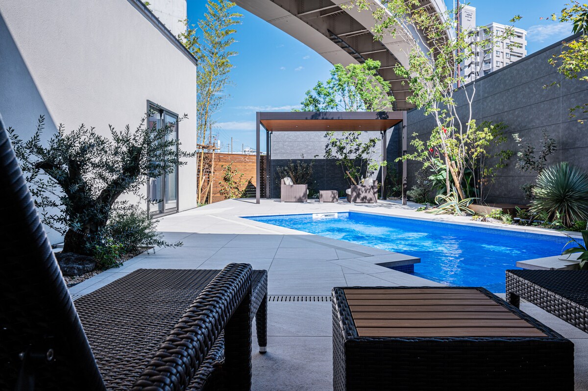 福岡の一棟貸しヴィラ・駅まで徒歩1分・プライベートプール・ゴルフシュミレーション・屋内サウナ