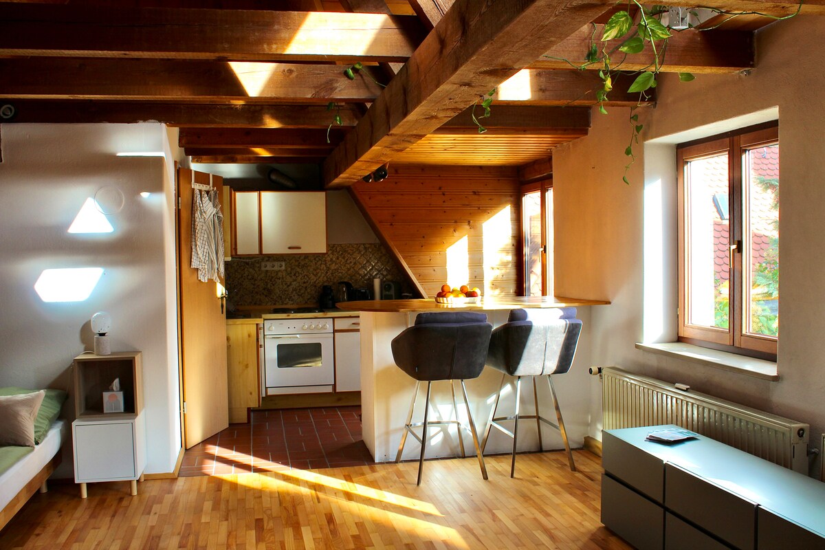 Loft in einer historischen Kutschenwerkstatt von 1910, 2025 vollständig saniert. Das Loft dient als wechselnde Kunstgalerie und Ausstellungsraum für Gemeinschaftswerke von Karl Zwieback und weiteren beteiligten Künstlern. Künstler können sich für gemeinsame Projekte bewerben, Übernachtung wird gestellt. Ziel ist es, weltweit die meisten Gemeinschaftsarbeiten zu realisieren. Hochwertige Ausstattung mit Fußbodenheizung, Boxspringbett, Designersofa, moderner Küche mit InduktionsherdWeinkühlschrank.