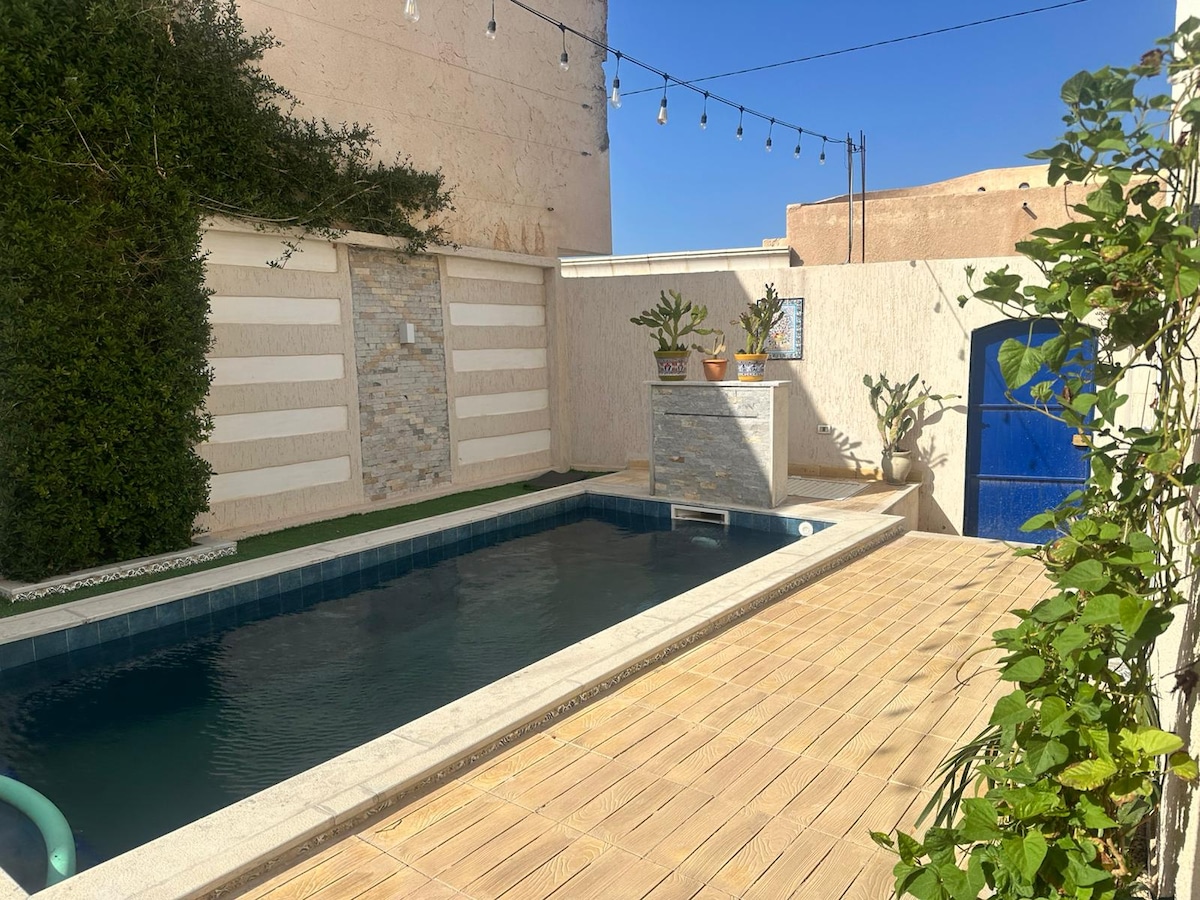 Komm und genieße die Ruhe des Teboulbou-Palmenhains in Gabes. 3 Kilometer vom Meer und 30 Minuten von Matmata, dem Tor zur Wüste, Dar Jamila bietet dir totale Ruhe. Garantierter Sonnenschein und Einheimische, deren Begrüßung und Freundlichkeit gut etabliert sind. Du kannst unseren Reiten in unseren eigenen Ställen genießen oder Granatäpfel oder Datteln oder andere Früchte pflücken. Diese elegante Unterkunft, die dir von einer Wache gesichert wird, ist perfekt für Familien. Klimaanlage..