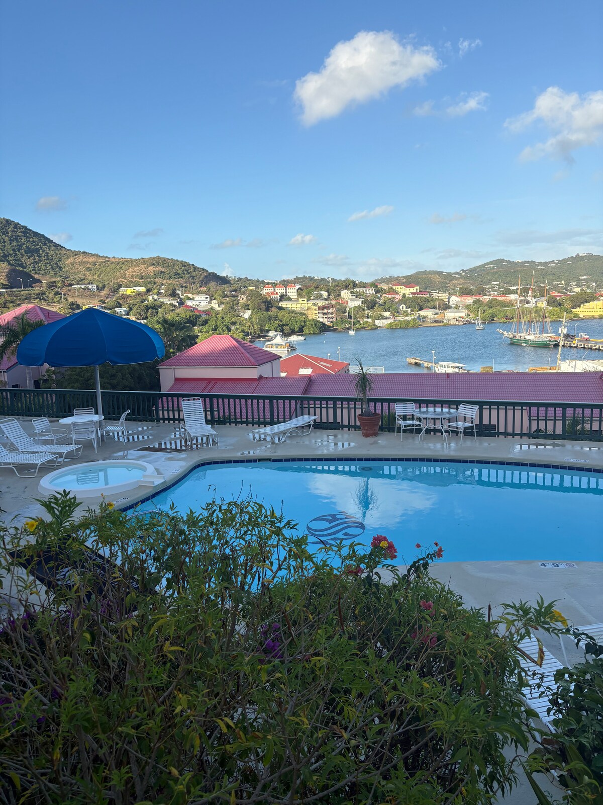 Gorgeous top floor end unit with both mountain and harbor views in one of the best condo complexes on the island! Schooner Bay Condos are tucked away on a hillside overlooking Christiansted Harbor, the Marina, Fort Christiansted, and Protestant Cay - conveniently located to everything! Walk to the market, shops, parks, restaurants, and Downtown Christiansted and Boardwalk. PLEASE NOTE: CONDO IS NOT ADA COMPLIANT. This condo requires climbing lots of stairs to access.