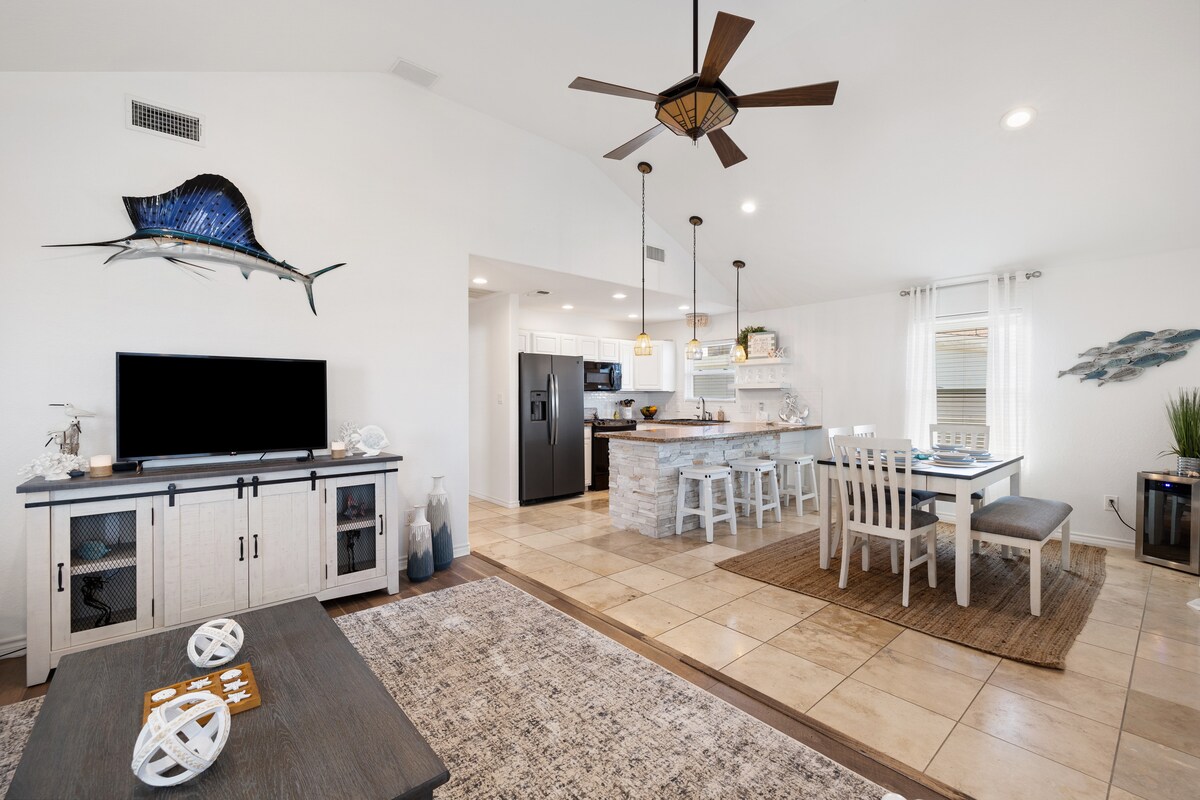 Das Tampico Breeze Haus am Wasser umfasst Kajaks, Paddelbrett, Tischtennis, Tischfußball, Darts, Cornhole, Fahrräder und mehr. Große Terrasse, Dock und Terrasse am Wasser mit Holzkohlegrill und Wet-Bar. Voll ausgestattete Küche mit neuen Quarz-Arbeitsplatten, offenes Wohn-/Ess-/Küchenkonzept. Großes Hauptschlafzimmer und zwei angrenzende Schlafzimmer mit kürzlich renoviertem großen Badezimmer und ein Etagenzimmer mit 2 Etagenbetten und einem eigenen renovierten Badezimmer. Kostenloses WLAN und TV-Streaming. Umzäunter Garten. Haustiere erlaubt!