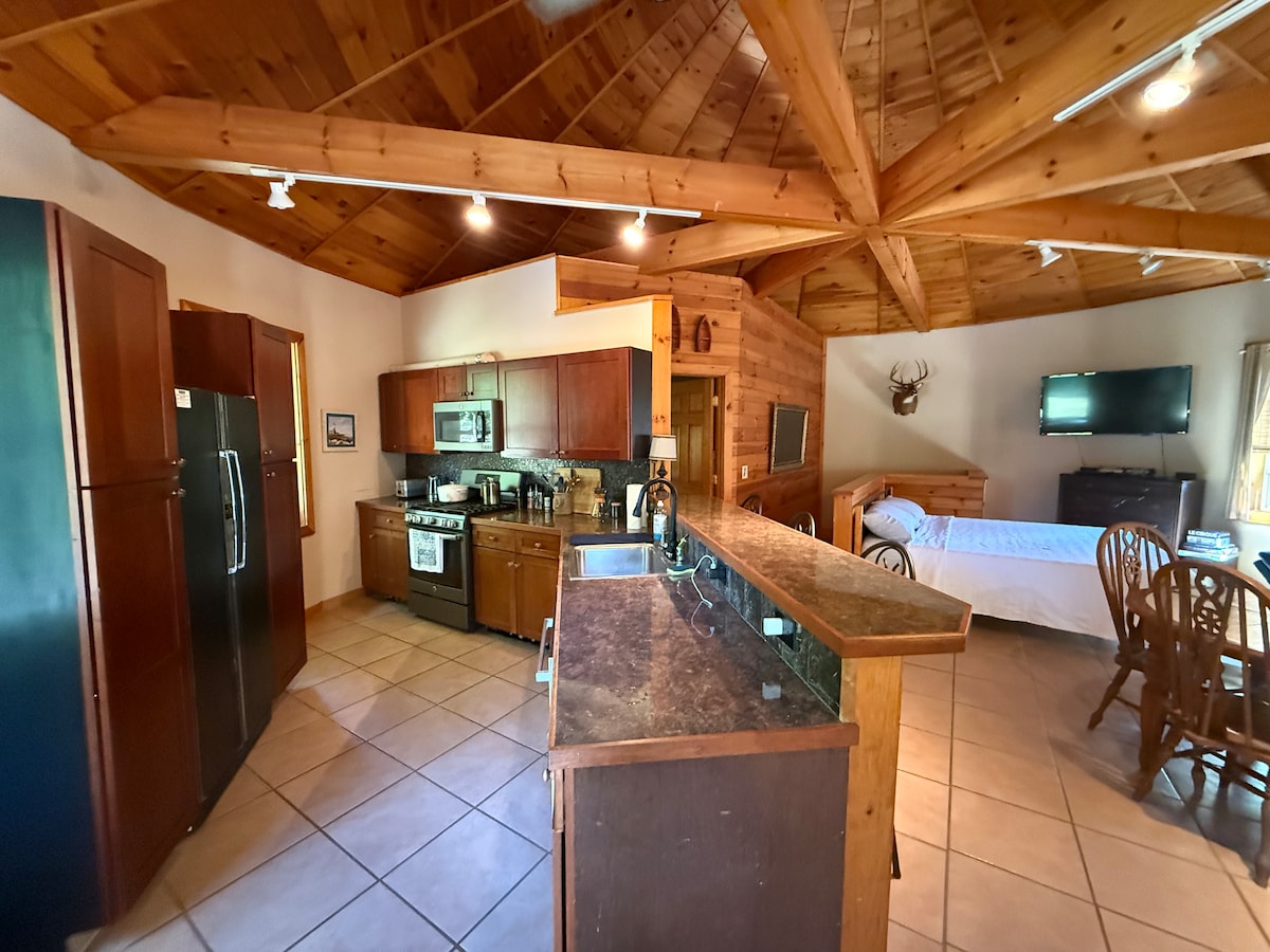 Discover a charming yurt-shaped house perched on a quiet hill with beautiful pond views. Inside is an open concept studio with a comfy king bed, two futons, a full kitchen, and bathroom. The large deck with dining area is perfect for meals outdoors, and the fire pit invites cozy evenings under the stars. Secluded and hidden from the road, this peaceful retreat offers a magical blend of comfort and nature’s beauty.