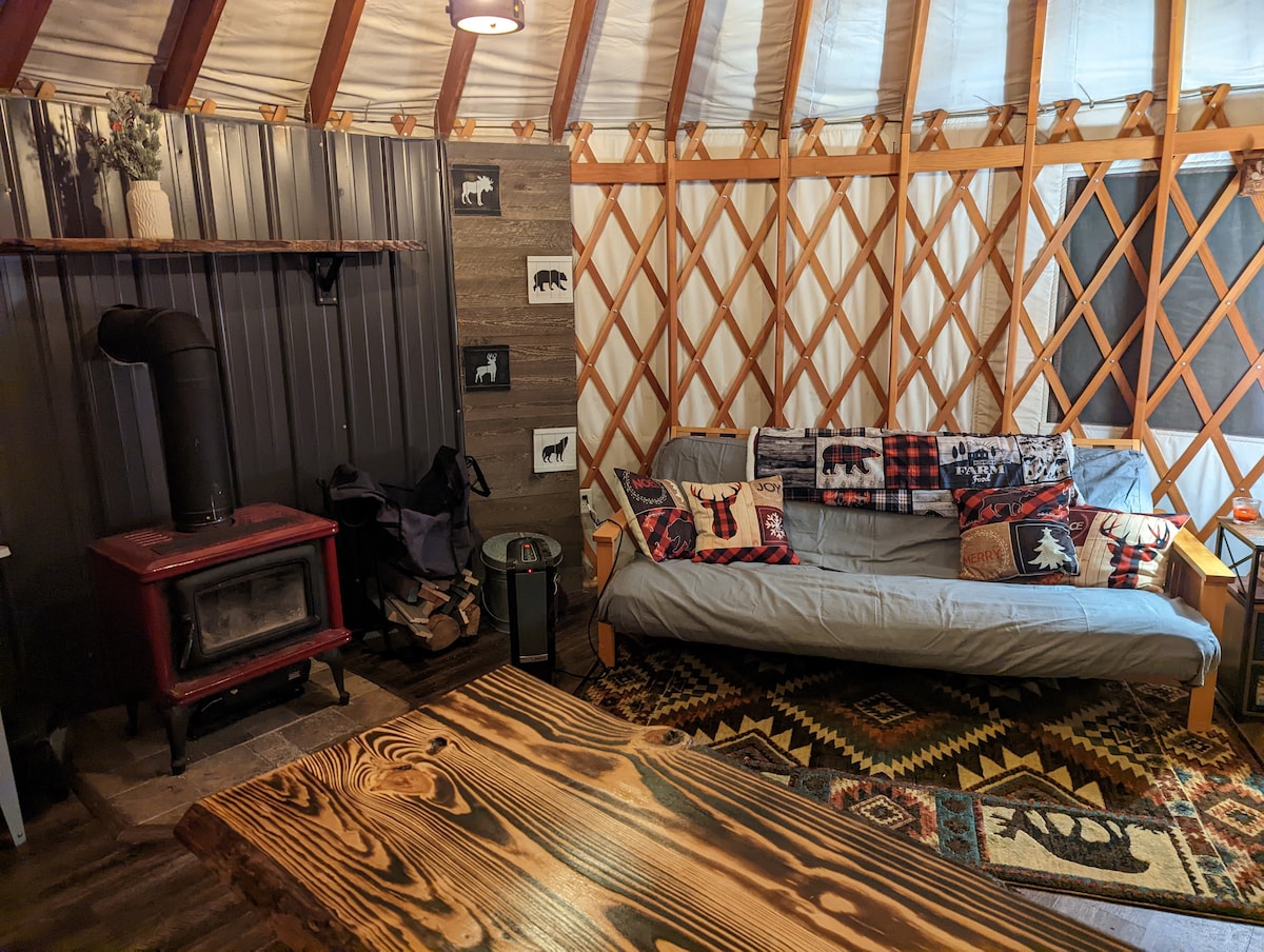 Surrounded by nearly 45 acres of secluded mountain forest a mile above the South Fork of the Payette River between Banks and Crouch, this private yurt offers true off-grid living with modern comforts. Enjoy electricity, Starlink internet, a mini-split for heat and AC, wood stove, propane cook stove and grill. Close to hot springs, hiking and river fun. Not for everyone. No running water, we provide fresh water and a clean porta-potty.