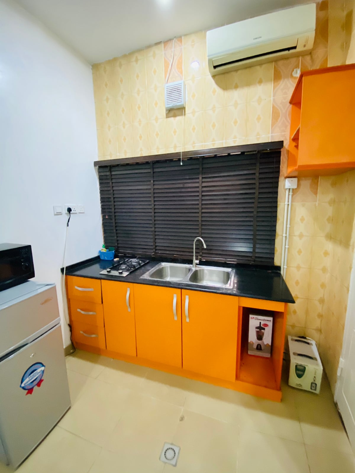 Escape the hustle of the city in this spacious, stylish studio apartment. The contemporary aesthetic of this space is perfect for couples’ getaways or solo travellers It is fully furnished + located in a secure estate. The space is serviced with free, super-fast Wifi & ample parking space The kitchen is fitted with modern equipment for your convenience. With 24/7 electricity, our smart TV & other luxurious amenities make this a home away from home, with the trappings of a dreamy hotel suite.