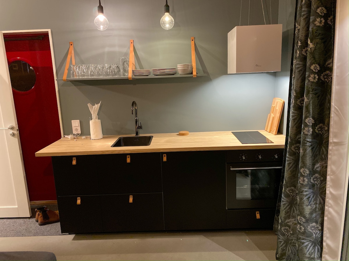 Der Innenhof ist aus dem Jahr 1909. Du wohnst unter den Dächern in der alten Scheune. Es gibt einen Herd, Mikrowelle, Kühl- und Gefrierfach, Kaffeemaschine, Wasserkocher. Es gibt immer Kaffee, Tee, Öl, Gewürze. Das Badezimmer, das 2021 neu ist, befindet sich direkt unter der Wohnung, aber du musst ausgehen, um es zu erreichen. Es gibt auch eine Waschmaschine. Auch die Toilette befindet sich dort.
