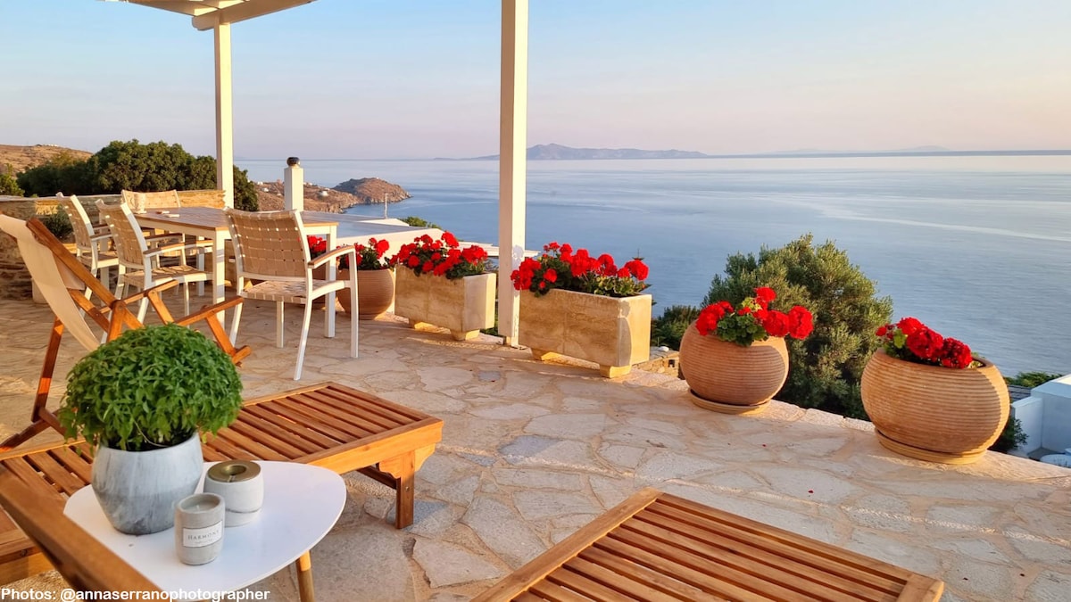 Ein helles Haus aus dem 19. Jahrhundert mit einer langen Familiengeschichte, mit einem Balkon und einer Terrasse mit einem Bar-Lounge-Bereich mit einem 180-Grad-Blick auf das Meer, in der malerischsten Umgebung auf den Kykladen, in der Nähe einer venezianischen Burg, eine Minute zu Fuß zum Schwimmen.