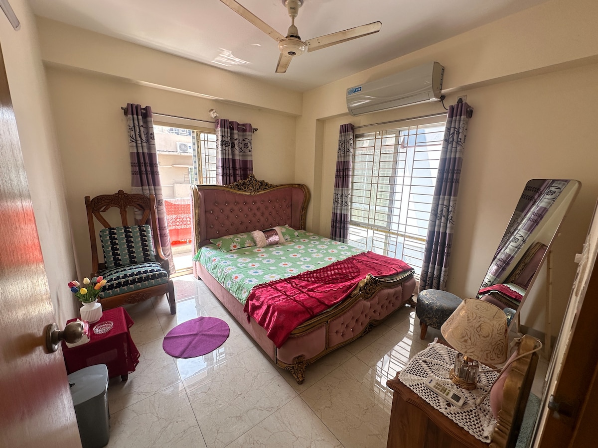 Entdecke deinen Traumaufenthalt in Dhaka! Diese neu eingerichtete Wohnung mit 3 Schlafzimmern und 3 Bädern verfügt über Klimaanlage in allen Schlafzimmern sowie kostenloses WLAN. Entspannen Sie sich bequem mit neuen Betten, Sofa, TV und einer blitzsauberen, voll ausgestatteten Küche mit neuem Geschirr. Ausstattung: Waschmaschine, 2 Kühlschränke, Mikrowelle, Haartrockner, Bügeleisen, Reiskocher. Beste Lage: 20 Minuten zum Flughafen, 5 Minuten zu Fuß zur Moschee. Lebensmittelgeschäfte und Restaurants in der Nähe (5 Gehminuten). Sichere Nachbarschaft, kostenlose Parkplätze. 7-Sitzer-Auto für tägliche Miete verfügbar.