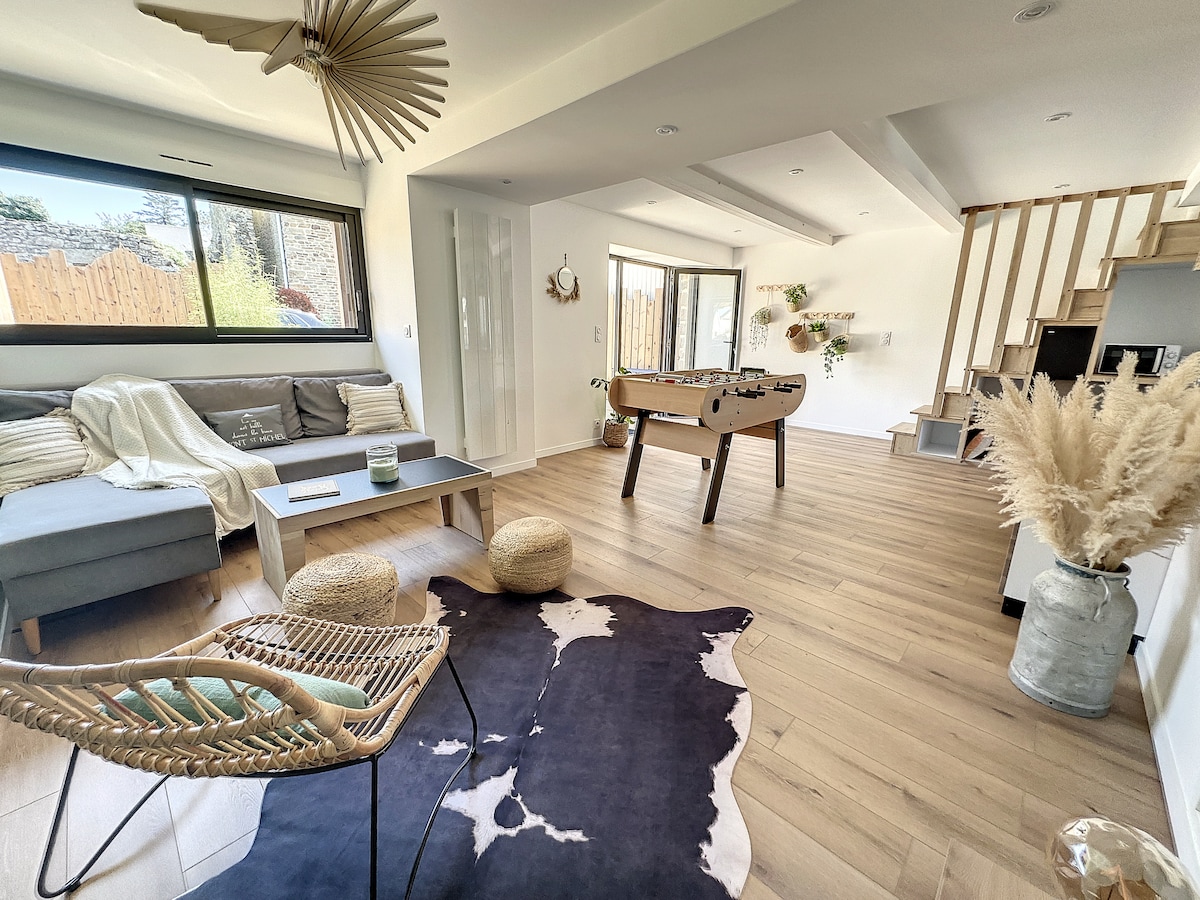 Somptueuse maison de ville en pierre de 110m2 avec sa dépendance de 38m2 avec jaccuzzi, sauna, hammam et sa pièce de massage ! Vous souhaitez vous ressourcer tout en visitant le Mont-Saint-Michel et ses alentours ? n'attendez plus c'est le bon endroit ! maison climatisé, une cuisine d'exception, des matériaux et équipement de qualité, une salle de bain de rêve, une literie haute gamme. Borne de recharge + 2 places de parking sécurisées linge de lit, serviettes, peignoir fournis